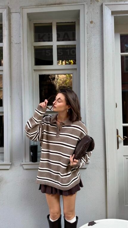 Striped Polo Collar Sweater Mink